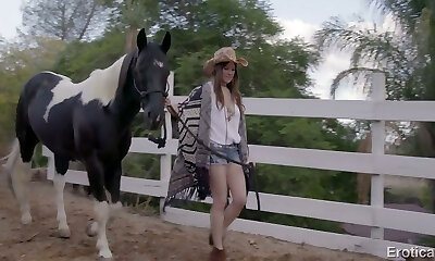 Fabulous auburn haired cowgirl munches dick and plumbed in the barn
