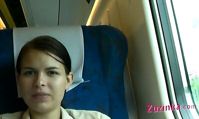 Shameless bitch Zuzinka flashes her shaved pussy in the teach