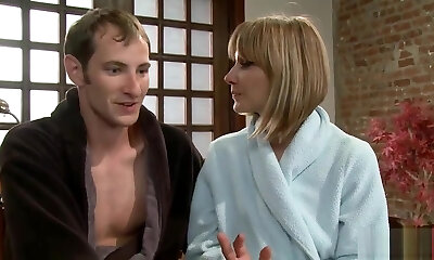 बुत महिला प्रभुत्व के साथ सुनहरे बालों वाली परिपक्व और उसके प्रस्तुत आमंत्रित प्रेमी-नियंत्रित बंधन और वर्चस्व