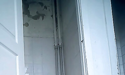 White amateur lady in blue jeans exposed on web cam in the toilet