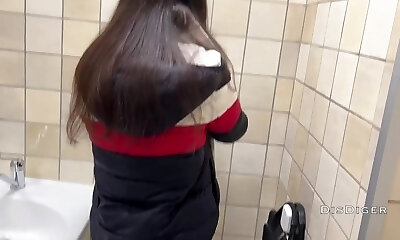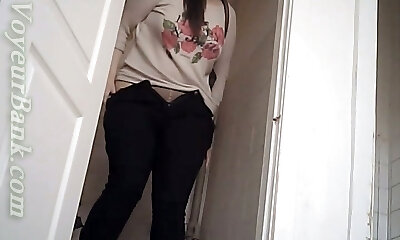 Brunette bodacious amateur woman in the toiletroom flashes her huge bootie