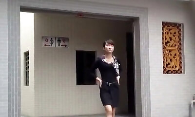 Unshaved pussy of a mature Asian gal in the public toilet room